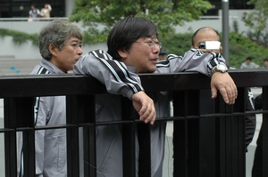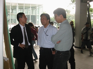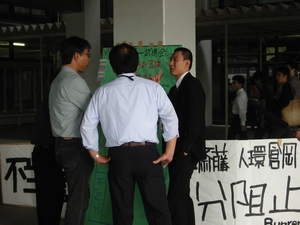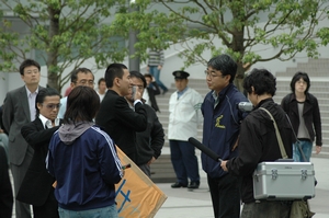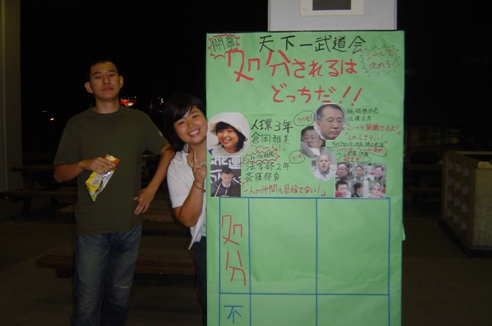 いつもいるはずの「ジャージ部隊」は姿を見せない。解雇か?逃げ出したのか?ともかく完全にジャージをぶっ飛ばして、キャンパスは解放されている! シール投票では圧倒的に、「ジャージ追放」にシールが貼られている。シール投票の結果に示されているように、ジャージ部隊は学生支配の破綻点になっている。集会の最後は、職員がジャージを着て、あらわれ、コソコソとビデオをまわす始末。学生が勝っているぞ!