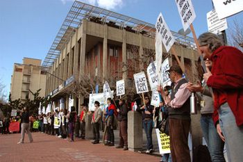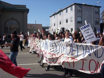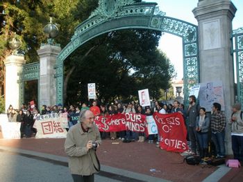 3月4日早朝、バークレー校のピケットライン(ストライキを守るための阻止線)の映像。バークレーの学生と一緒に「団結」の横断幕を持った訪米団の姿も多数! 洞口朋子も英語で叫んでいます! ピケットラインを超えようとする教授(?)を追い返すところも出ています。 「Whose University?」「Our Univirsity!」を連呼! 大興奮です!