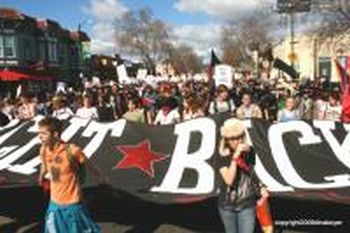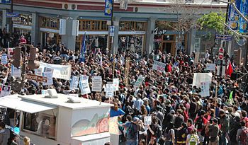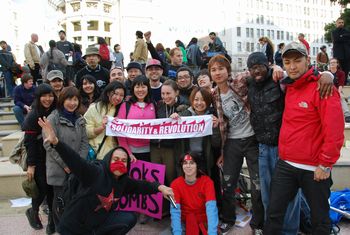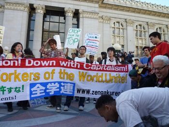 ●現在は、サンフランシスコで1万人以上の労学集会が進行中。カリフォルニア大の学生が代表発言で、「日本の全学連の仲間がかけつけてくれています!」と報告。まだまだ3・4は継続中です。