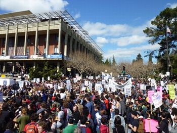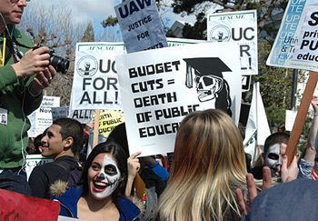 巨額の歳入欠陥にあえぐ同州では政府の予算カットが響き、カリフォルニア大学各校の学費が約3割アップ、負担増は年1万ドル(約90万円)以上に達する見通しとなっている。(時事ドットコムより)(2010/03/05-20:06)