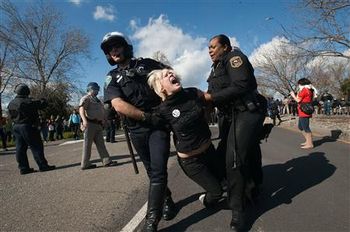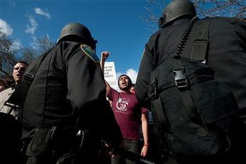教育費削減反対デモで抗議する学生を連行する警官=4日、カリフォルニア州デイビス(AP) 米CNNテレビなどによると、カリフォルニア州やテキサス州など30州以上で4日、州政府による教育予算カットに反対する学生らのデモがあり、カリフォルニア州オークランドでは高速道路に侵入したデモ参加者約120人が警察に逮捕された。