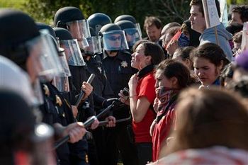 オークランドに近いカリフォルニア大バークリー校では学生らが一部の校舎前でバリケードを築くなどした。ロサンゼルスでも中心部にある州政府のビルに数千人の学生が集まった。