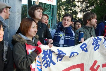 「昨年9月、11月の行動が直接には授業料値上げに対する怒りの行動だったことに対し、今回の3・4ストライキは公教育の破壊=民営化に絶対反対する闘いとして闘いとられ、数千人の学生が立ち上がったことは決定的。教育の民営化は、大恐慌によってもたらされている。資本主義が崩壊を開始し、その延命のために教育や医療などの社会的インフラを民営化している。だから、民営化に反対する闘いは、社会全体を変革する闘いだ。学生は静かに見えるが、怒りを持っていない学生はいない。問題は、この怒りを一つにできるかということ。そうすることができるリーダーを闘いの中でつくりださなければならないし、私たち自身がそのようなリーダーになろう。今回の3・4ストは、国際連帯における歴史の新たな1ページを開いた。国際的団結を拡大し、日本でもストライキを闘いたい。そのときにはぜひ日本に来てほしいし、またこのような闘いがあったら駆けつけて団結していきたい」