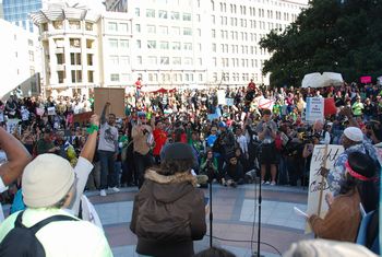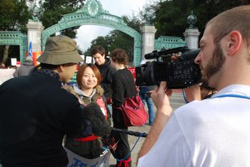 ●バークレー校前では、2000人が通りを封鎖し、オークランドまでデモ。オークランドで4000人の集会。そこで、洞口さんが日本代表で発言!