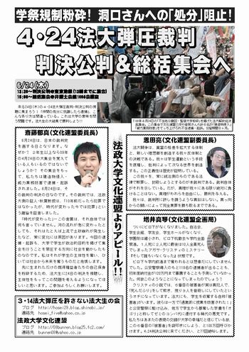 6月24日は、日本の裁判史を画する日となります。なぜか? 2年生以上なら09年の4月24日の大集会を覚えている人もいるのではないでしょうか? その集会をもって、私たちは建造物侵入・威力業務妨害で逮捕・起訴されました。6月24日は、その裁判の判決の日なのです。その裁判では、法政大側の証人・秋葉教授は、「10年前だったら犯罪ではなかったが、時代が変わった今では犯罪」という趣旨を証言しました。