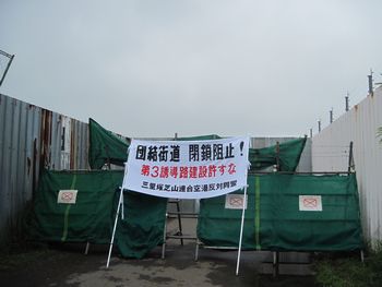 現闘本部から団結街道上の北側も封鎖。バリケードがつくられている
