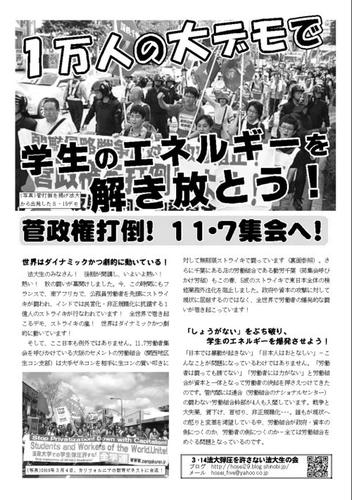 「民主党はおかしいけど他にやる政党はあるの?」「労働者・学生に力はあるのか?」-今、求められていることは、社会に満ち溢れているあらゆる怒りを1つに糾合し、現場の労働者・学生の本来持つ階級性と共同性、戦闘性を引き出す行動方針です。それが11.7全国労働者総決起集会なのです。「国が財政破綻しているからしょうがない」「会社の危機を救え」と労働組合が労働者の闘いを押さえつけている中、11.7集会に1万人の労働者・学生を結集されることができたなら必ずや日本の労働者・学生に展望を与え、首都東京から世界を揺るがす集会を実現することができます。この時代を絶望やあきらめの時代ではなく、社会変革の主体として歴史の最前線に躍り出る時代として、11.7労働者集会をともに闘い抜いていこう!