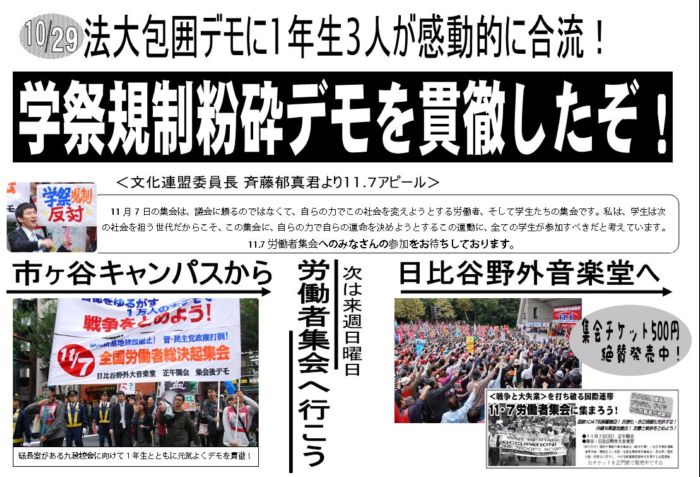 11月7日の集会は、議会に頼るのではなくて、自らの力でこの社会を変えようとする労働者、そして学生たちの集会です。私は、学生は次の社会を担う世代だからこそ、この集会に、自らの力で自らの運命を決めようとするこの運動に、全ての学生が参加すべきだと考えています。11.7労働者集会へのみなさんの参加をお待ちしております。