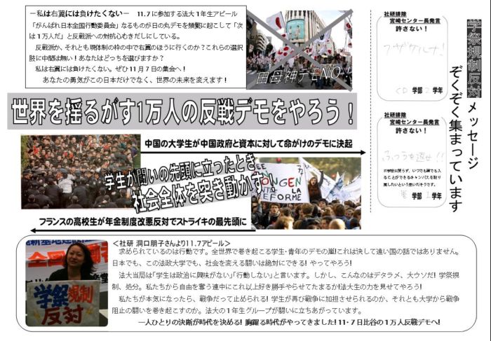 法大当局は「学生は政治に興味がない」「行動しない」と言います。しかし、こんなのはデタラメ、大ウソだ! 学祭規制、処分。私たちから自由を奪う連中にこれ以上好き勝手やらせてたまるか!法大生の力を見せてやろう!