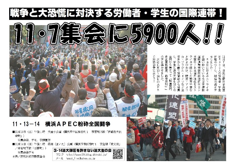 この社会を喰い物にしている奴らの代表たちがこの11月の13日に横浜に集まってくることがわかっています。そう、APECのことです。こんな奴らの思惑どおりになるわけにはいかない。日本にはおれたちがいるってことをあいつらに示してやろう! 全ての労働者・学生は11月13・14横浜APEC粉砕闘争に立ちあがろう! おれたちの「戦争反対」の意志、「学問とは、教育とはどうあるべきか」という意志を、あいつらに見せてやろうじゃないか! 一緒に闘おう!
