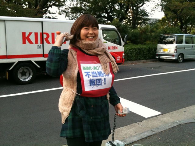 10日ぶりに元気に門前に登場し、この間の闘いの報告と処分撤回を訴えました。