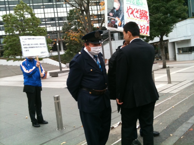 本日昼休み、私たちが演説を始めたらヤクザともう一人が弾圧看板を掲げてやってきましたが、月曜の弾圧看板徹底弾劾行動によって完全に意気消沈状態!