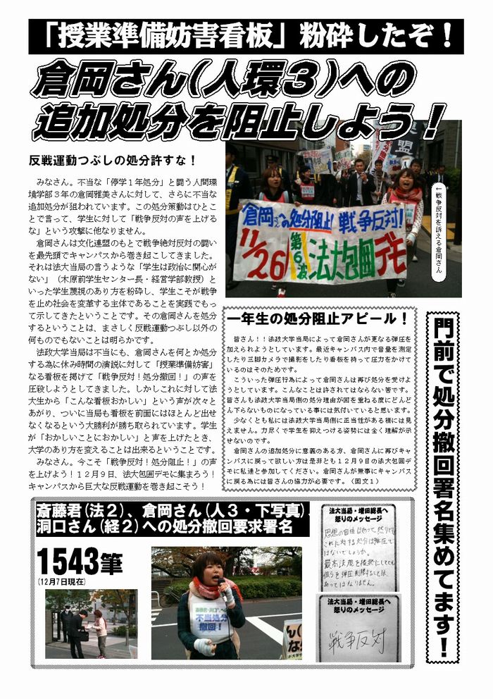 倉岡さんの追加処分に意義のある方、倉岡さんに再びキャンパスに戻って欲しい方は是非とも12月9日の法大包囲デモに私達と参加してください。倉岡さんが無事にキャンパスに戻る為には皆さんの協力が必要です。(国文1)