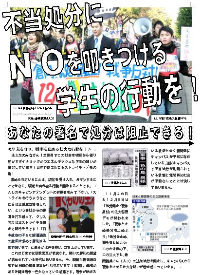 11月26日と12月9日は「処分阻止・戦争反対」の法大包囲デモが闘われました。「戦争と止め処分を止めよう」「処分を止め、戦争をとめよう」このかけ声の下、この法大でも、倉岡雅美さん(人3)の追加処分を阻止し、キャンパスから戦争を止める壮大な闘いが巻き起こっています。