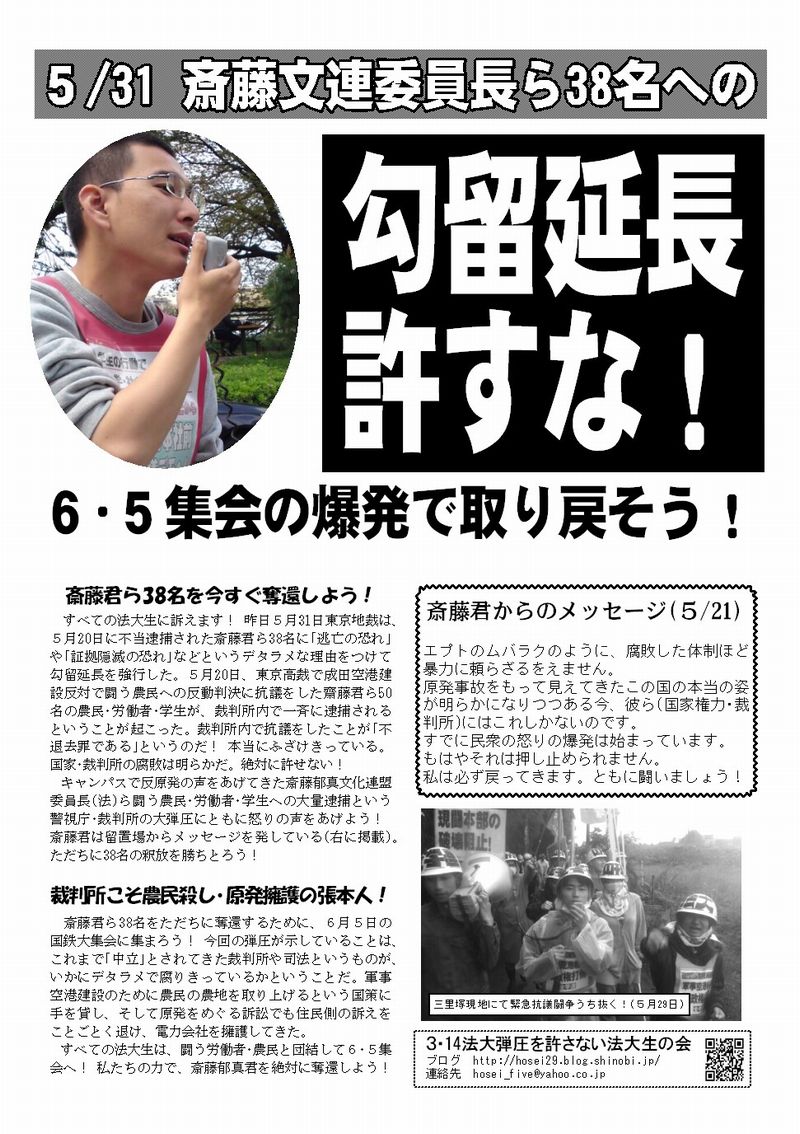 すべての法大生に訴えます! 昨日5月31日東京地裁は、5月20日に不当逮捕された斎藤君ら38名に「逃亡の恐れ」や「証拠隠滅の恐れ」などというデタラメな理由をつけて勾留延長を強行した。5月20日、東京高裁で成田空港建設反対で闘う農民への反動判決に抗議をした齋藤君ら50名の農民・労働者・学生が、裁判所内で一斉に逮捕されるということが起こった。裁判所内で抗議をしたことが「不退去罪である」というのだ! 本当にふざけきっている。国家・裁判所の腐敗は明らかだ。絶対に許せない!
