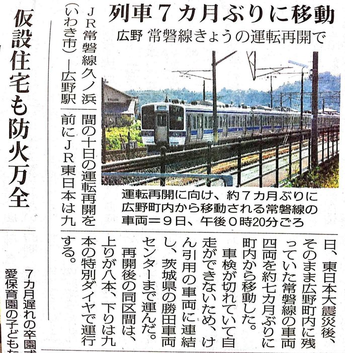 また、広野に放置されていた常磐線の車両(放射能まみれだ!)が勝田車両センターに移動されたという記事もあります。