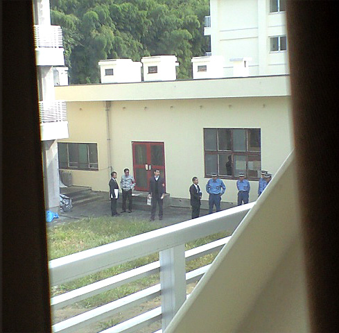 10月13日、富山大学当局と富山地方裁判所は、新樹寮の自治寮廃寮攻撃に反対してA棟に住む仲井祐二君に対して、仮処分裁判の決定を理由に新樹寮A棟から仲井君を叩き出す強制執行を行った。しかも、仲井君本人には仮処分裁判の決定、強制執行を通知することなく、大量の大学職員と警察を引き入れて、部屋の荷物をすべて持ち出し、A棟を封鎖する不意打ちの強制執行だ。絶対に許せない。(写真は強制執行にやってきた職員と警察)