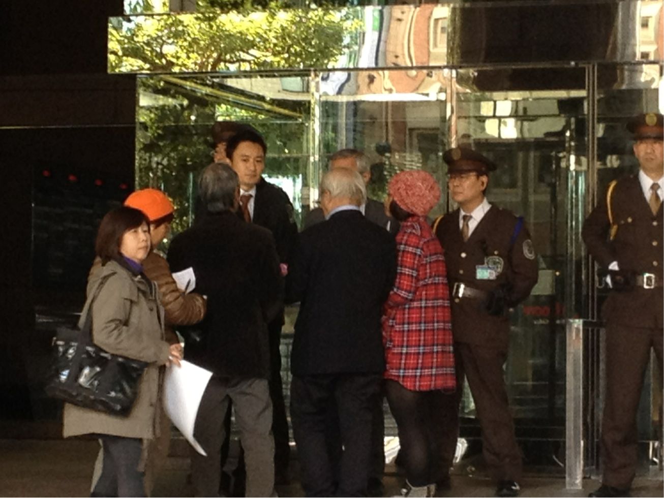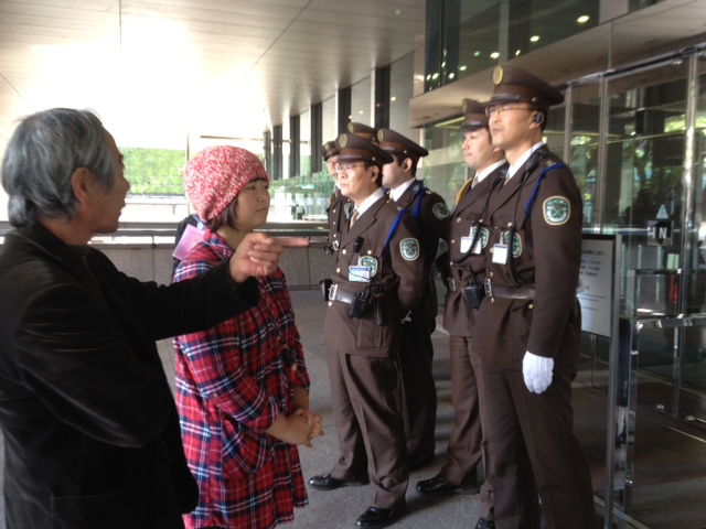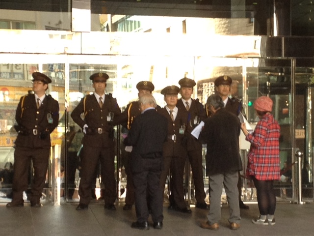 何と警備員が私たちを本社にいれさせまいとスクラムを組んでいます。