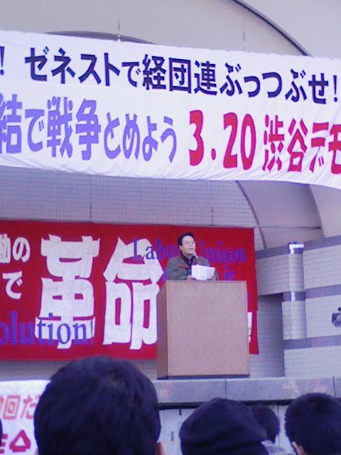 「4者4団体はワールドピースナウのイラク反戦集会に行っている。民営化に賛成してる奴らが反戦を闘えるのか。断じて否だ!!」