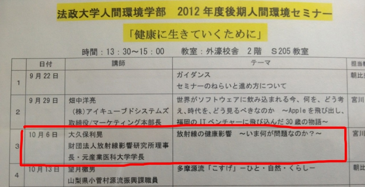 そして一方で、人間環境学部が「健康に生きていくために」と称し、山下俊一と並ぶ極悪御用学者・大久保利晃(放影研理事長、「100ミリシーベルトまでなら浴びても大丈夫」という立場)を呼んでセミナーを今週土曜13:30に行います。ナンセンス!