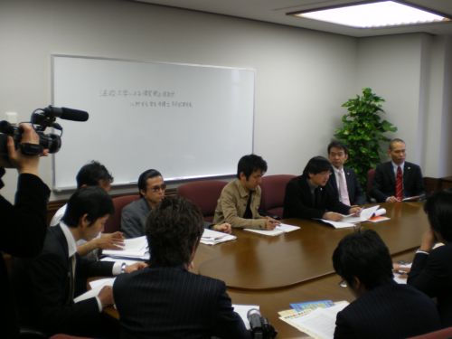 法大当局による情宣禁止仮処分に対する反撃! 17日午前、弁護士会館において、法大当局による情宣禁止仮処分に対する緊急記者会見を行いました。代理人になっていただいた62名の弁護士を代表して、藤田弁護士、森川弁護士、花澤弁護士が挨拶。久木野君、恩田君、中島君が当該の8名を代表して発言しました。記者会見には、13社の新聞・テレビの記者が集まり、質問攻めに。「4・24法大当局は仮処分をやってくるのか?」「学内ストーキングの実態は本当ですか?」「多くの弁護士が代理人になっている理由はなぜか?」などの質問に答えました。「いつもブログは見ています」という記者も。4・24に向けて、マスコミ関係者の注目も集まっています!