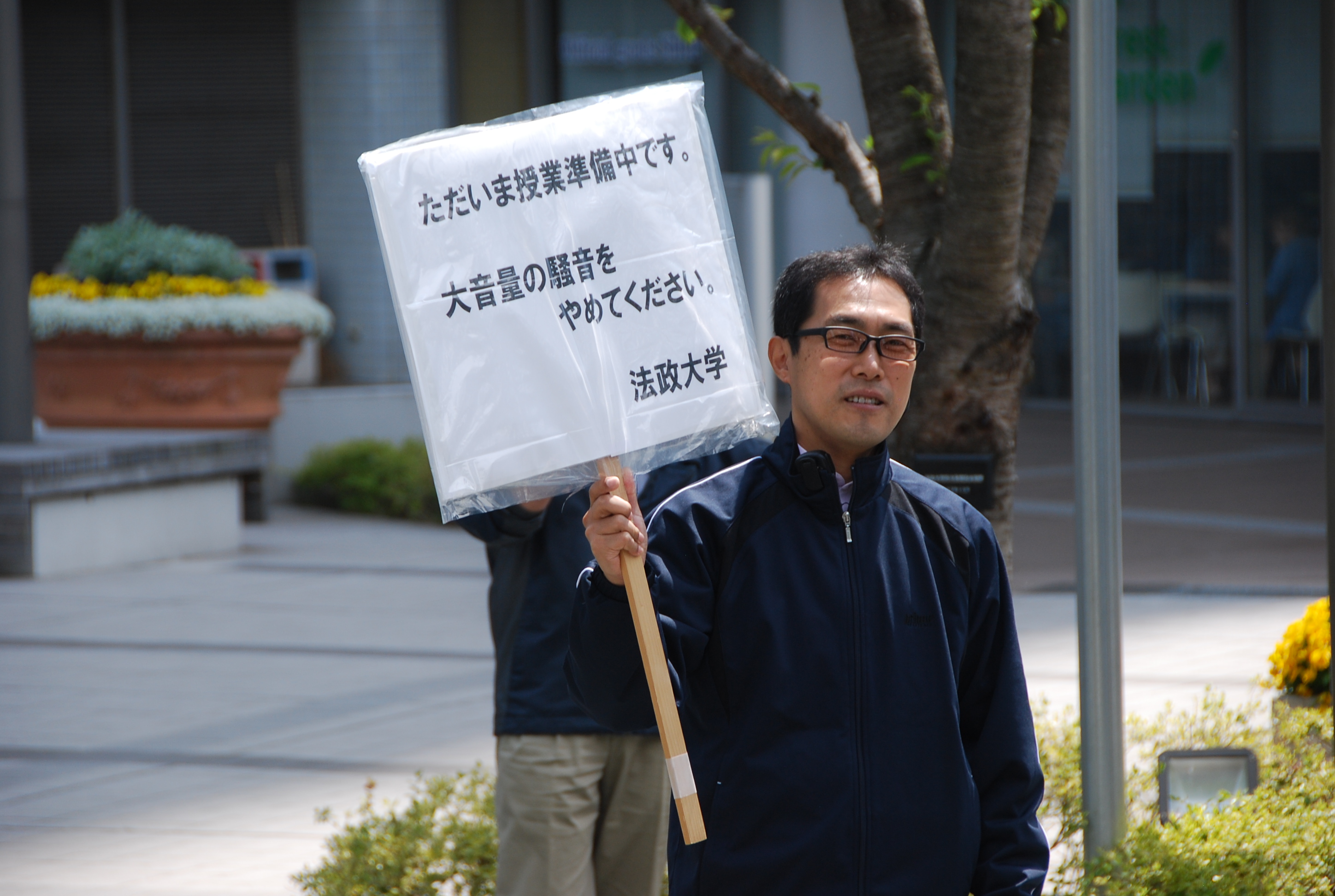 「授業準備妨害」の看板を掲げる法大職員