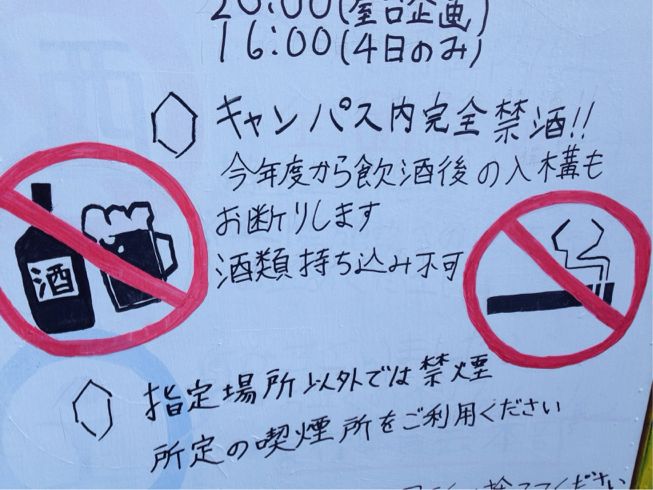 今年から学外で酒を飲んだ人が入構禁止になっています。