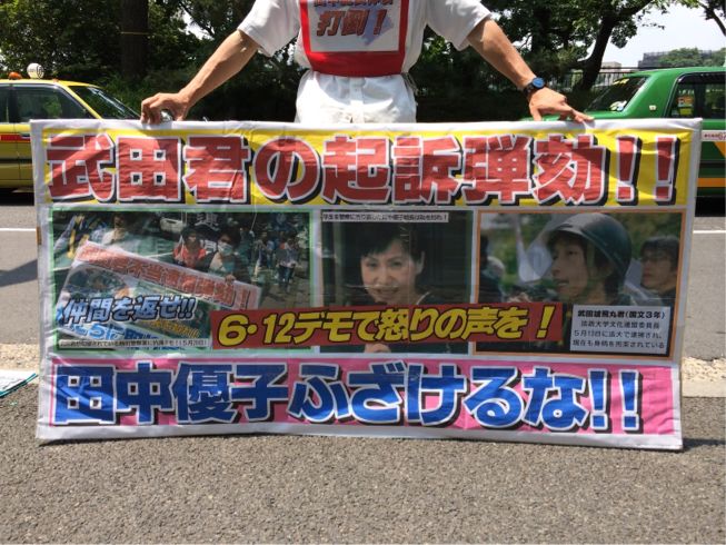 武田君の起訴は、法大当局と国家権力による前代未聞のでっちあげ弾圧です。「器物損壊」で現行犯逮捕しておいて、それが破産するや、「暴行」に切り替えて起訴!!でたらめ極まりない弾圧を強行した法大当局と国家権力は恥を知れ(怒)