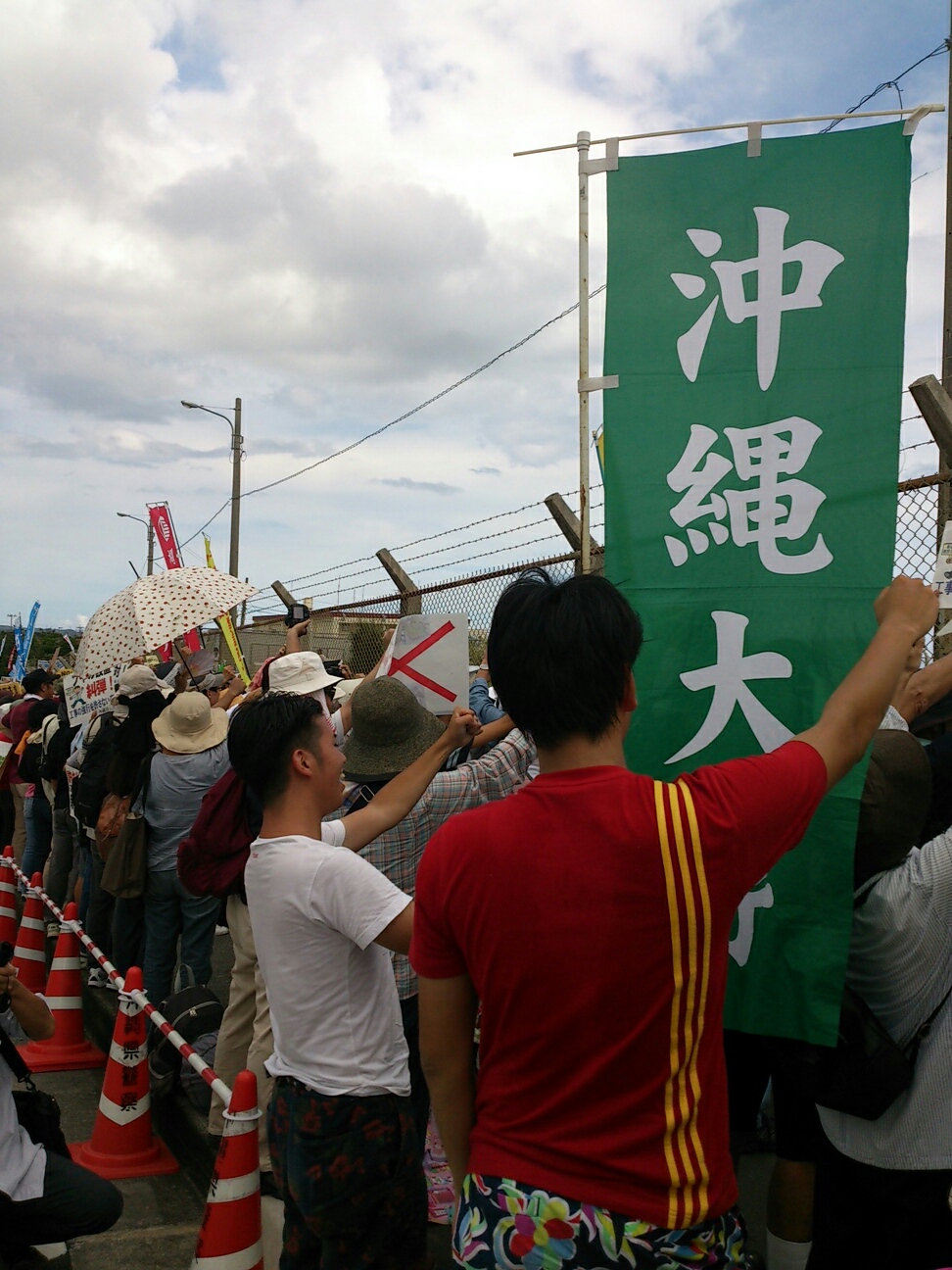 那覇市職労など、労働組合もバスを出して参加していました。沖縄大学学生自治会も、赤嶺委員長とF君がゲート前近くに旗を立て、闘いの先頭に立ちました。