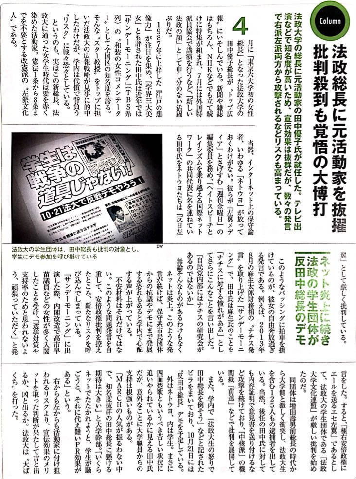 『「サンデーモーニング」に出演した際、内閣改造で高市早苗議員などの女性が多く入閣したことを受け、「選挙対策や支持率のためと思われないよう、頑張っていただく」と発言をした。すると「極右安倍政権にエールを送るエセ左翼」であるとして、法政大の学生団体である「法政大学文化連盟」が厳しい批判を始めたのだ。』