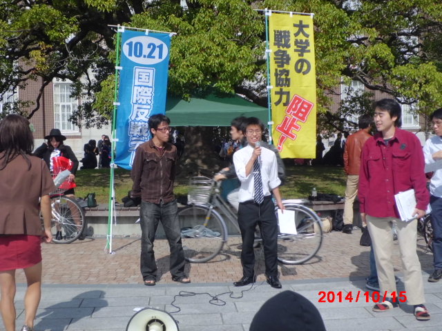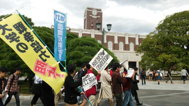 10月15日、京都大学で「この国のために死んでたまるか! 10.15京大集会」が台風一過の晴天の下、元気よく開催されました。同学会中央執行委員会の呼びかけで、京大生を中心に20名以上の学生、労働者が集まりました。