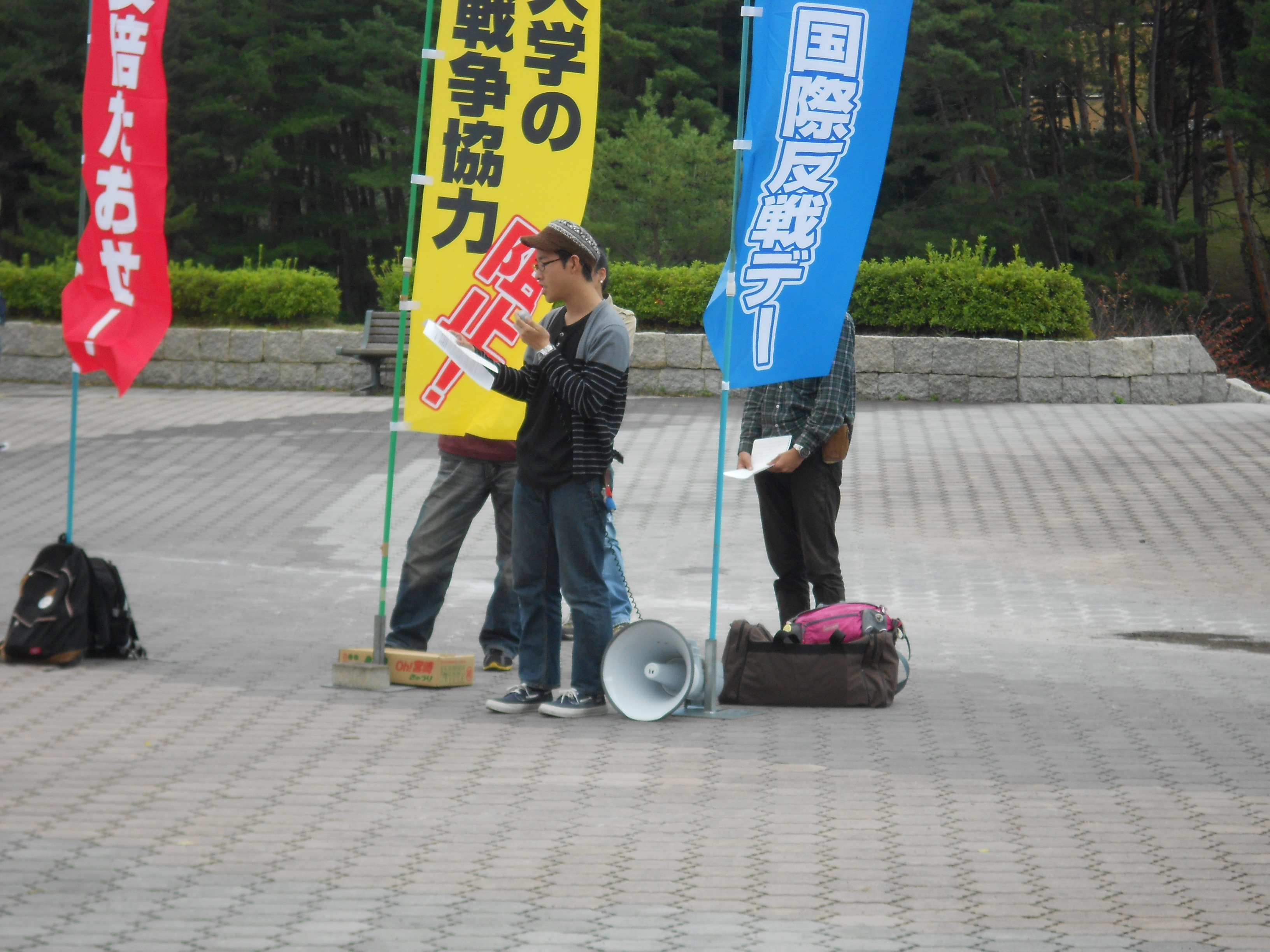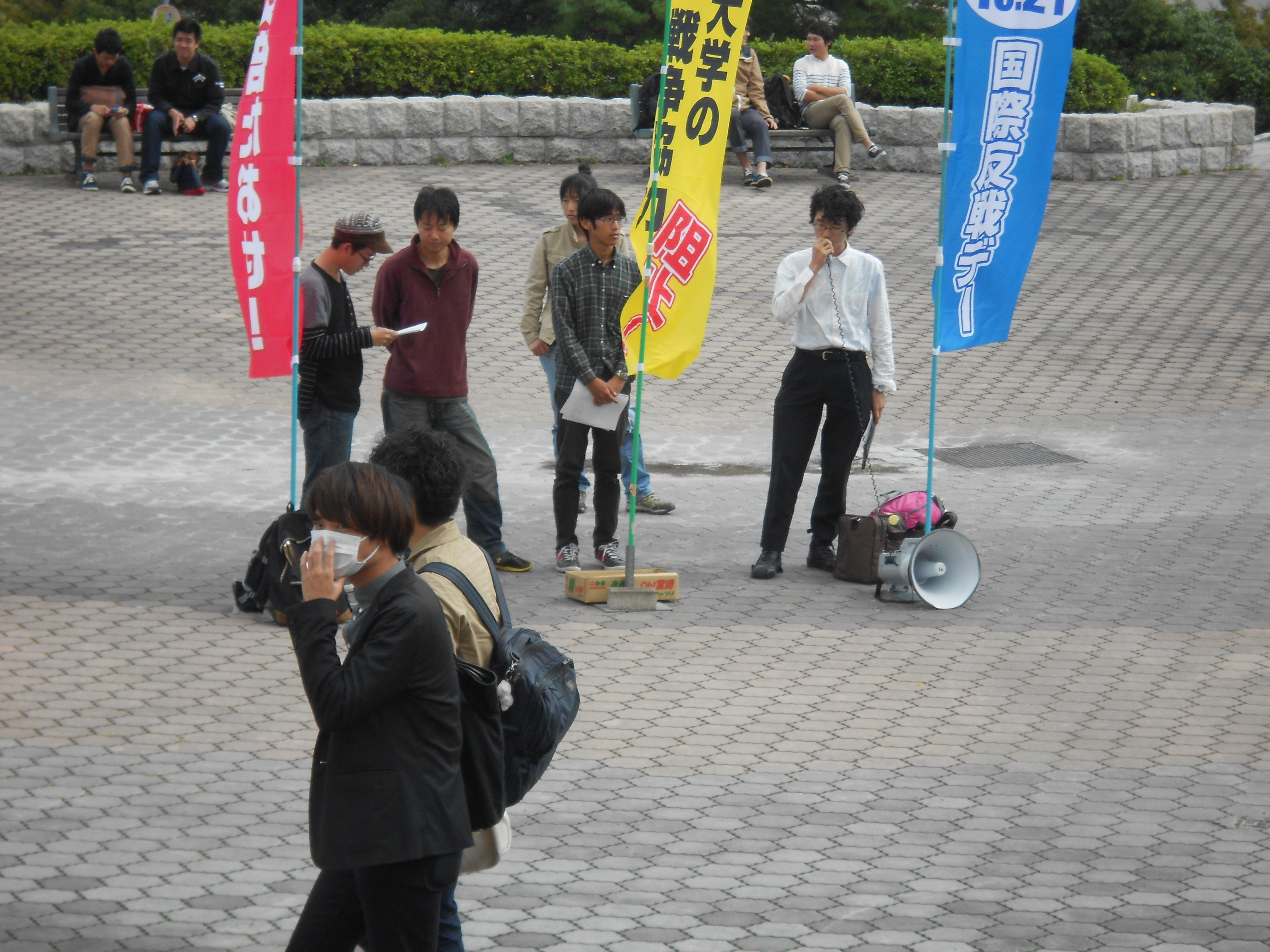 そして、広大生の反戦アピール。はじめに当該の1年生が発言しました!1年生はイラク・シリア戦争の不正義性を訴えるとともに、これからも弾圧に負けないでやっていく決意を表明!それに続いて、教育学部の学生からもアピール。10・21国際反戦デーを訴え、子どもたちを戦場に送るようなことはあってはならないと訴えました。終わりには留学生から預かっていたメッセージを読み上げました。戦争絶対反対の思いとともに、研究生として広大に留学している学生の実態が暴露されました。バイトをやらなければ、「学費免除も奨学金も出せない」と言われた体験も交えて、留学生を高い学費で搾り取り、安い労働力としてこき使う…こんな「グローバル」大学絶対反対!と広大生に、とりわけ留学生に訴えました。