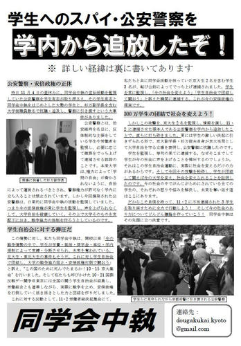 同学会中央執行委員会の大森です。11月2日に逮捕された学生への10日間の拘留延長が決定されています。彼らは完全黙秘しているので、これまでの組織活動の情報をスパイし、政治的に拘留をする必要があると情報を流している人物が必ずいるはずです。その一翼が京大内で昨日摘発され、大学全体で弾劾できたことは、本当に大きな勝利です。