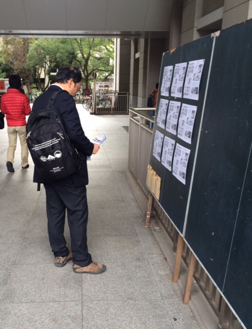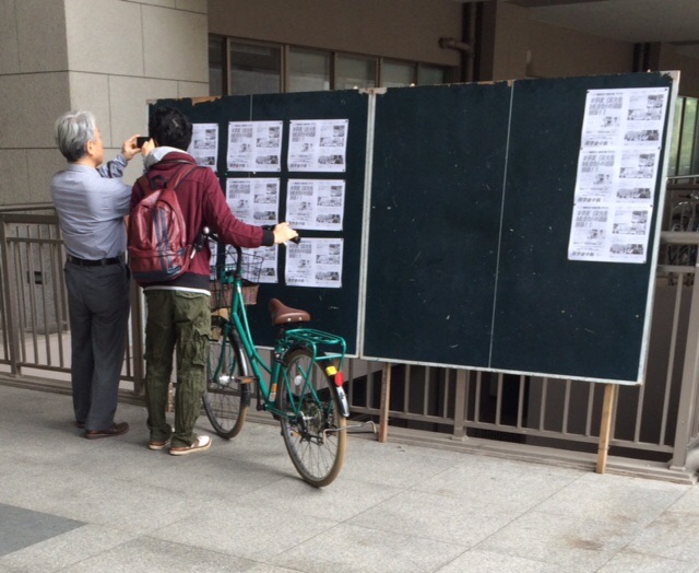 同学会看板を食い入るように見入る労働者•学生