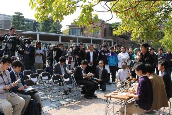 京都大(京都市左京区)のキャンパスで、無断で立ち入った警察官が、学生らに取り押さえられ、約3時間半後に解放された事案をめぐり、現場近くで当時、演説をしていた学生団体「京都大学同学会中央執行委員会」のメンバーらが7日、京大で記者会見を開催。時計台前の広場に机と椅子を並べた会見場が設営され、通りかかった一般の学生は驚いた表情で様子をながめていた。