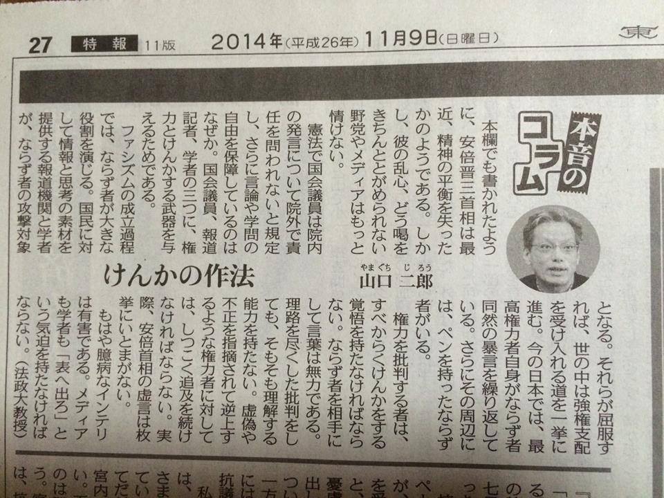 11/9の『東京新聞』の「本音のコラム」で、法政大学教授の山口二郎が「けんかの作法」と称して、安倍首相への批判を述べた後に、以下のように言っています。