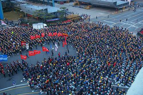 【写真】現代重工業労働組合が2015年賃金交渉闘争勝利出発式を開催し、正規職・非正規職組合員2500人が参加し、共同闘争として闘い勝利することを誓い合った。事務職の女性組合員も参加(4月23日 現代重工業時計塔交差点)