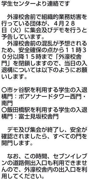 法大当局がまたしても、デモにあわせて外濠門を封鎖するというメールを全法大生に送りつけてきました。