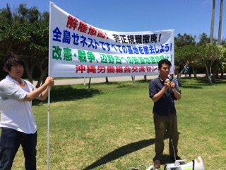 5.15平和行進集約集会に結集した全島全国の労働者に、沖縄大学学生自治会とIJBS労組のビラが、吸い込まれるように受け取られていきました❗ IJBS解雇撤回署名もたくさん集まりました❗