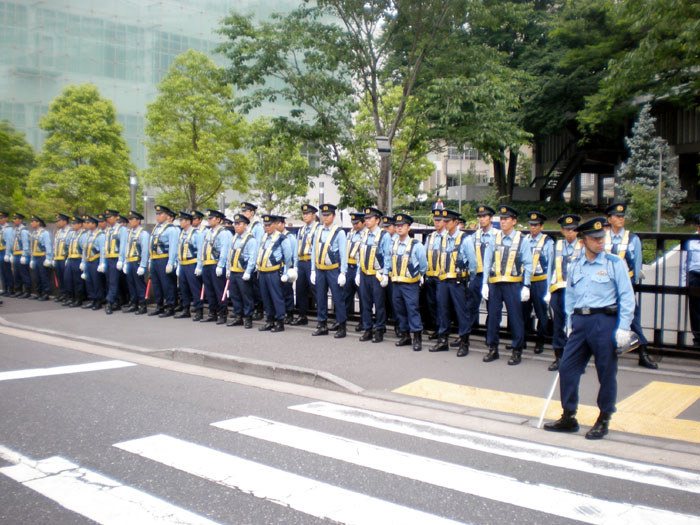 続いて、こちら写真右手です。ボアソナードタワーのラウンジですよね。いつもはラウンジからガラス越しに見通せるのですが、本日はなんと我々が登場したらブラインドが下げられました。