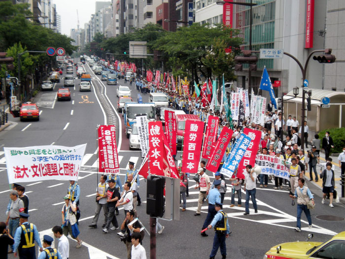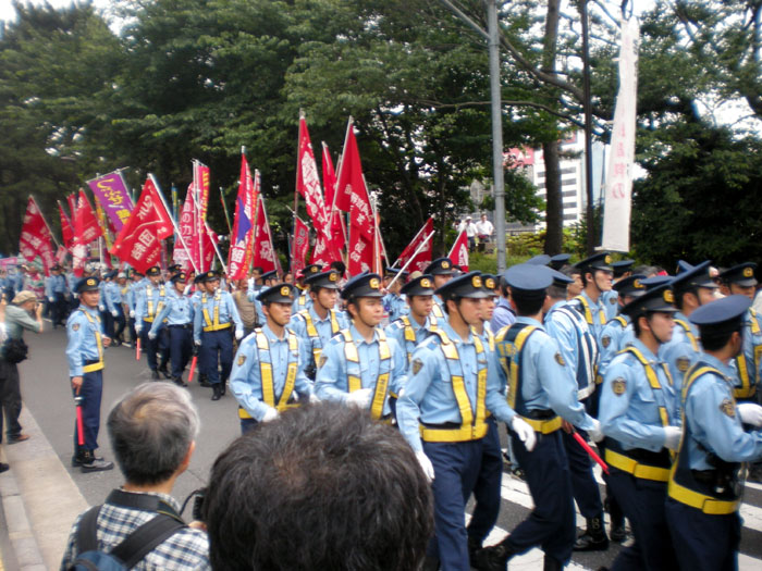 さて、デモ隊ですが、最終的には1200名のデモになりました! 1200名! 法大当局・国家権力はもうブルブルですよね。一応、デモの圧倒的スケールが伝わればと高所より苦労して写真を撮ってみました! 後ろの方に延々と旗が続いているのが見えますかねぇ…?