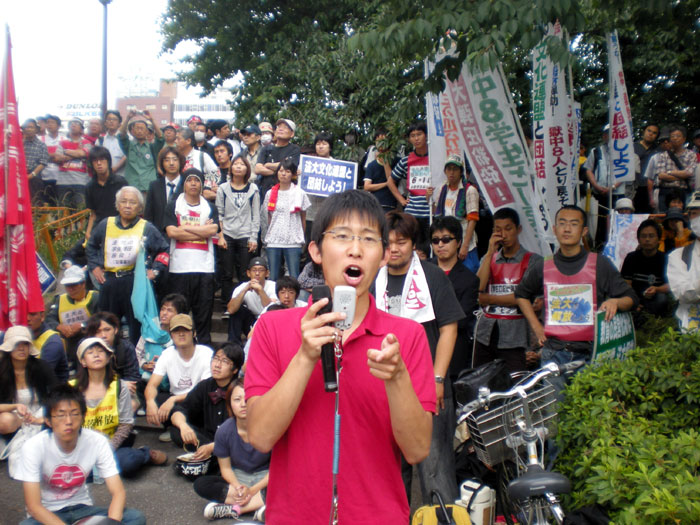 森川弁護士からも熱いアピールが。洞口さんは、本日が法大当局からの呼び出しだということで、そのことへの徹底弾劾と、これが呼び出しへの回答だと熱いアピールがなされました。