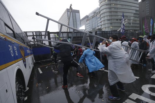 一部の参加者が鉄パイプを振りかざすなどしたといい、警察は催涙成分を混ぜた水を高圧放水してデモ隊を鎮圧した。参加していた60代の男性が放水の直撃を受けて道路にたたきつけられ、病院に搬送されたが脳出血を起こすなど重体とみられる。