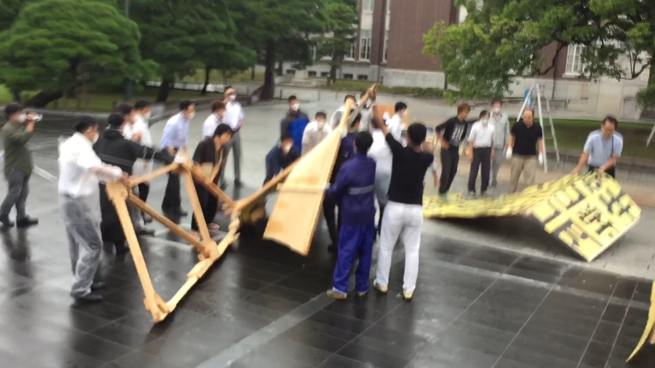 本日早朝、京大生有志がクスノキ前にたてた看板を京大当局が破壊し撤去しようとしました。
