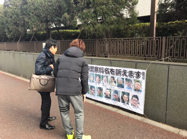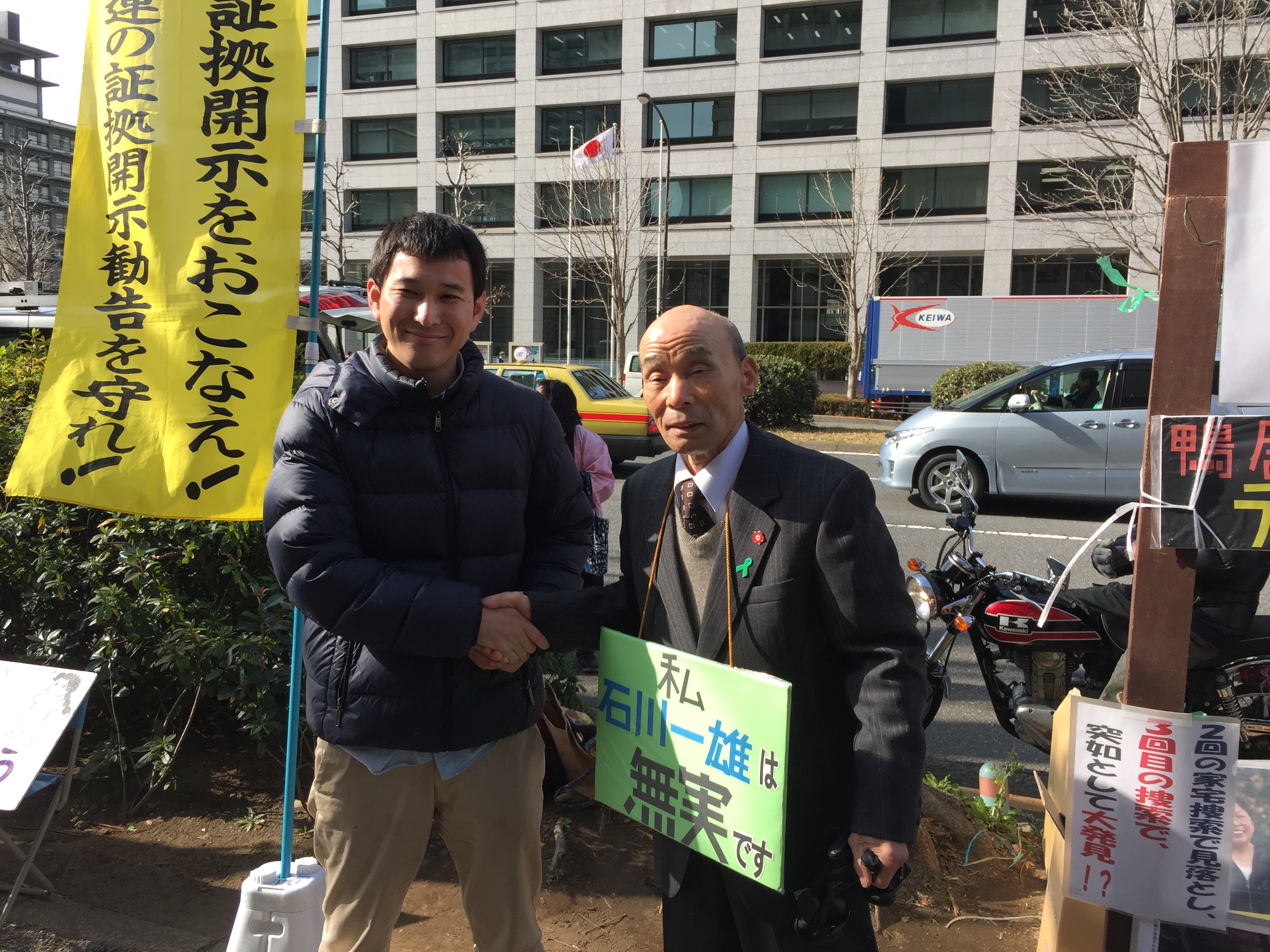 狭山再審闘争を闘う石川一雄さんが裁判所前で情宣を行なっていました。