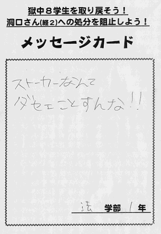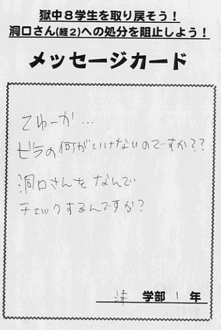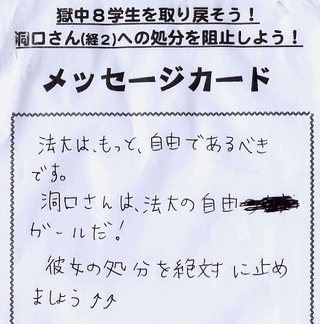 獄中8学生を取り戻そう! 洞口さんへの処分を阻止しよう! の「メッセージカード」が次々と寄せられています。一部を紹介します!