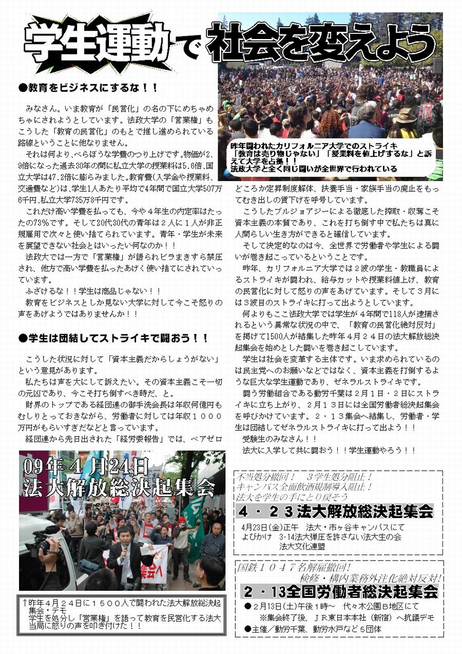 何よりもここ法政大学では学生が4年間で118人が逮捕されるという異常な状況の中で、「教育の民営化絶対反対」を掲げて1500人が結集した昨年4月24日の法大解放総決起集会を始めとした闘いを巻き起こしています。