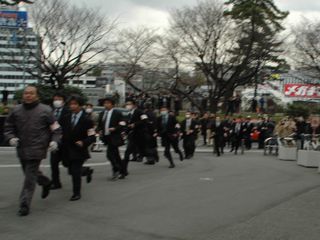 当局に続いてバイト君3人が、当たり券をもってやって来たものの、すでに傍聴券引き換えの締め切り後(開廷10分前までに引き替えないと入れない)。はじめからその算段だったのだろう。そのままタクシーで逃亡。