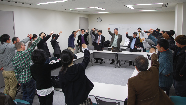 ↑弁護士会館で行われた総括集会でシュプレヒコール