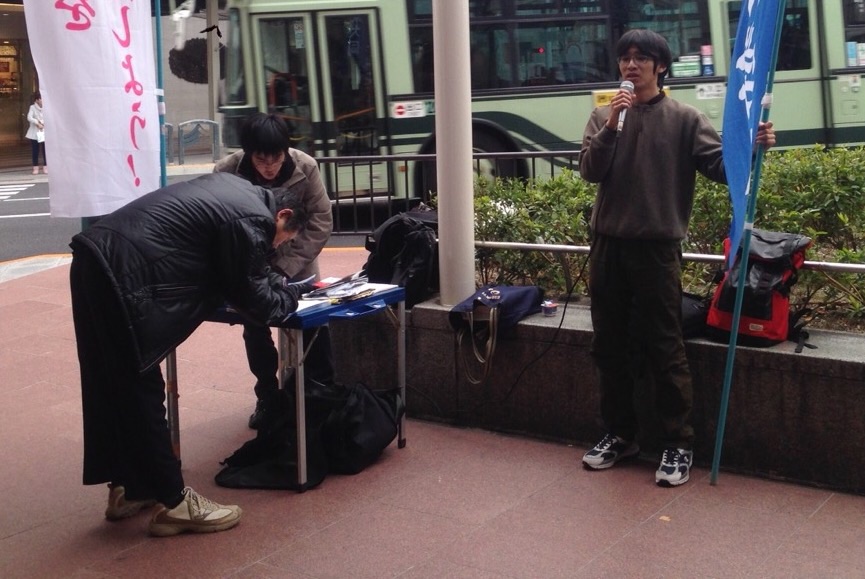 昼と夕方にかけて四条河原町でも街頭宣伝を行いましたがこちらも素晴らしい反応で、たくさんの署名が集められました。多くの人々がこの弾圧を知っていると言い、許せない!がんばれ!という激励や署名が続々と寄せられました。地元の方はもちろん、旅行で京都に来たという人たちからも支援を申し出る声があがるなど、学生の身体をはった反戦ストライキへの支持は京都内だけにとどまらない広範なものになっています。家族の分まで署名したい!という人、ぜひメールして欲しい!と連絡先を教えて来た人など本当に様々な、ここだけでは書ききれないような数の反応がありました。青年学生も含めた広い年齢層の人がビラを受け取り、署名してくれたのも特筆すべき事態ですね。今回の弾圧は完全に、団結の拡大を生むというかたちで反撃に転化しています。今日、私たちに賛同や支援を申し出てくれた方々の想いに応える意味でも、京大反戦ストライキを闘った6人の学生を一刻も早く取り返したいです。